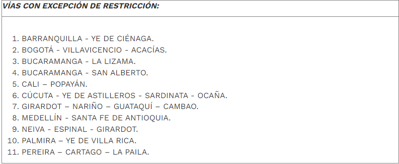 El viernes también aplicará  en las vías “Popayán - Pasto – Ipiales - Rumichaca”, “Bogotá - Fusagasugá - Melgar - Ibagué” e “Ibagué - Calarcá – La Paila”, en ambos sentidos, de 12:00 m a 11:00 p.m.