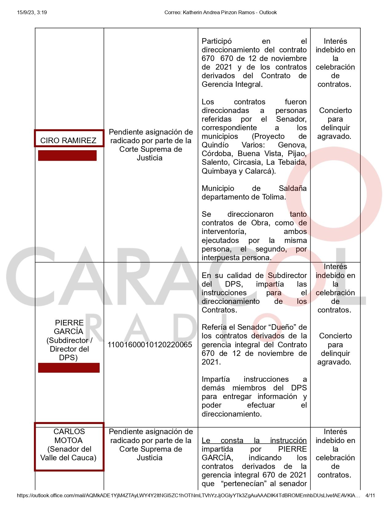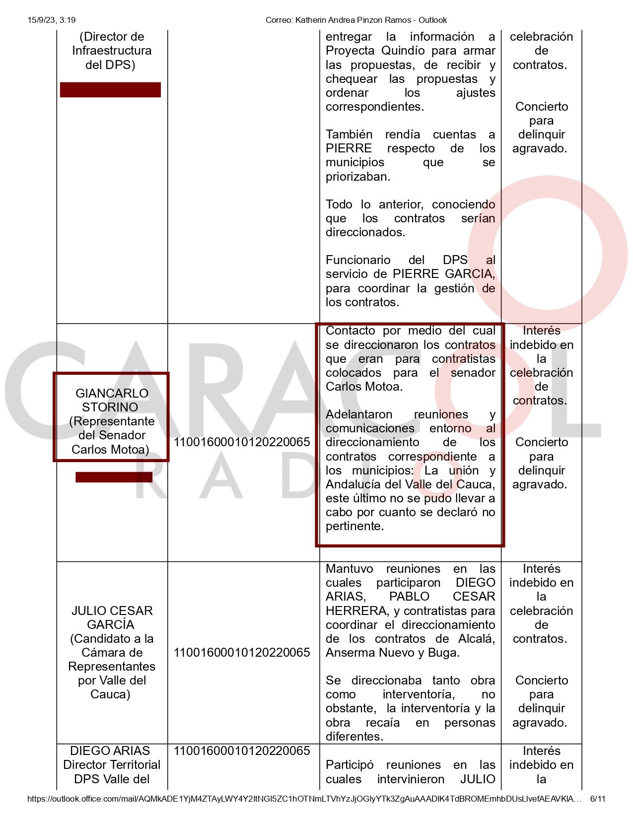 “Le consta la instrucción impartida por Pierre García, indicando los contratos derivados de la gerencia integral 670 de 2021 que “pertenecían” al senador Motoa. Pierre suministró el contacto telefónico de Giancarlo Storino, para adelantar el direccionamiento.