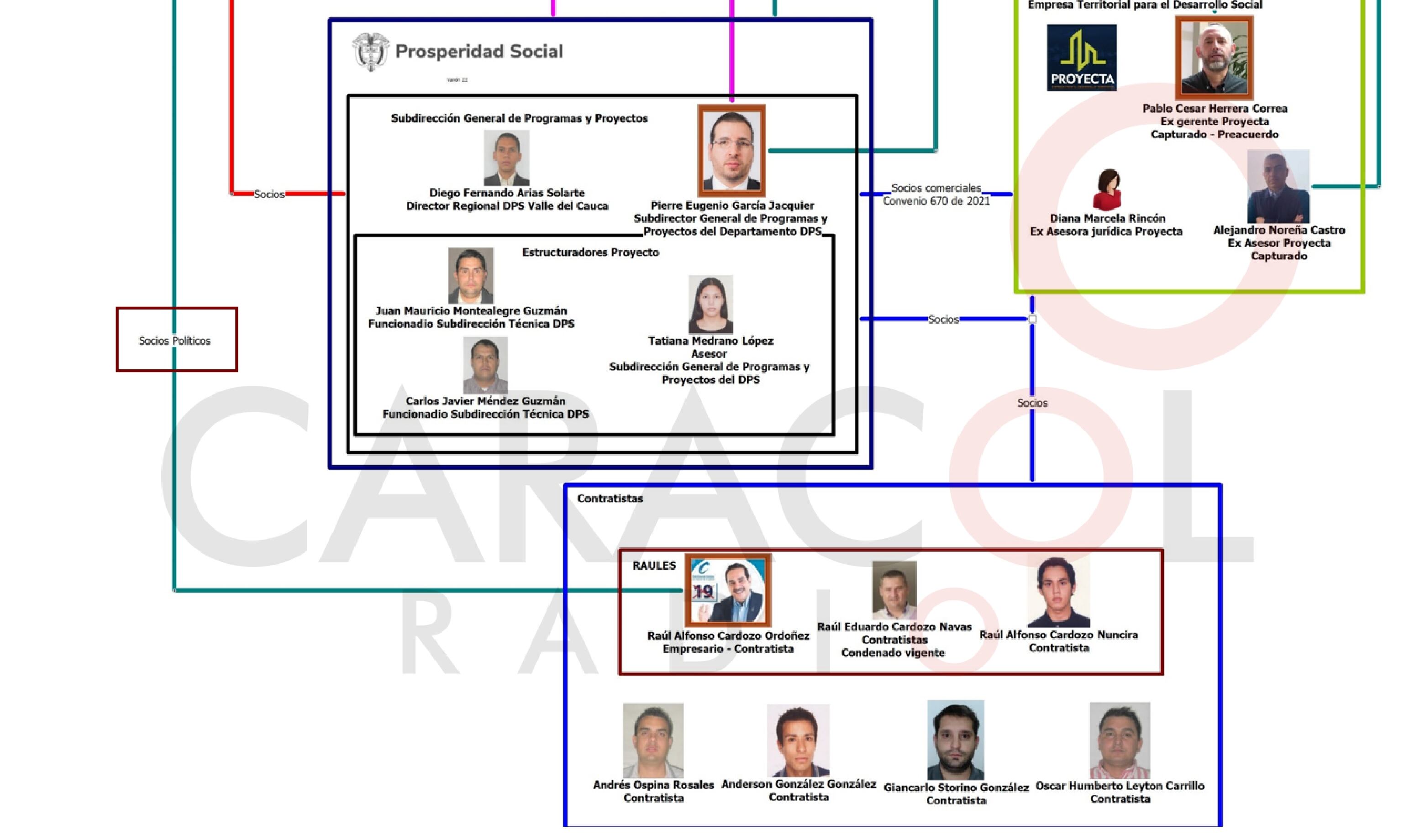 El organigrama de la red de corrupción, que se dedicó a manipular la contratación pública para sus intereses políticos y personales, se creó a partir de información que aportó Pablo César Herrera, el exgerente de Proyecta Quindío y hoy en día uno de los testigos principales de la Fiscalía y de la Corte Suprema de Justicia.