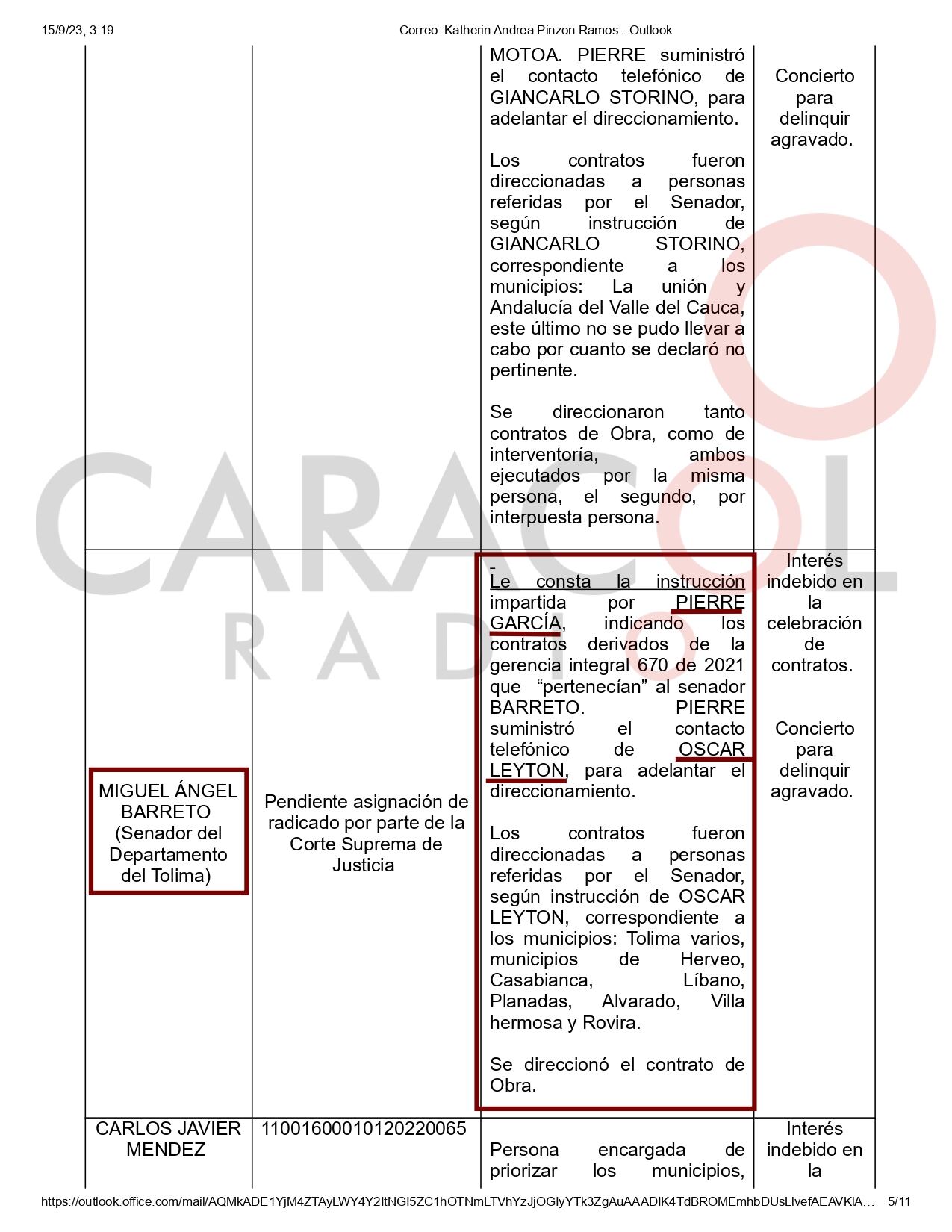 “Le consta la instrucción impartida por Pierre García, indicando los contratos derivados de la gerencia integral 670 de 2021 que “pertenecían” al senador Barreto. Pierre suministró el contacto telefónico de Oscar Leyton, para adelantar el direccionamiento.