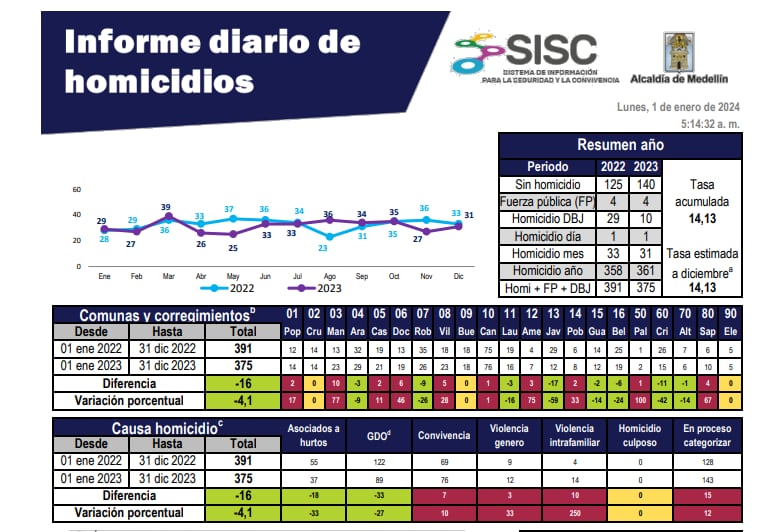 Según el Sistema de Información para la Seguridad y la Convivencia durante el año 2023 se registraron 375 homicidios, con una disminución del 4,1% en comparación con los 391 ocurridos en el 2022. Sin embargo, es importante aclarar que aún hay 143 casos en proceso de categorizar, por lo que la cifra podría variar.