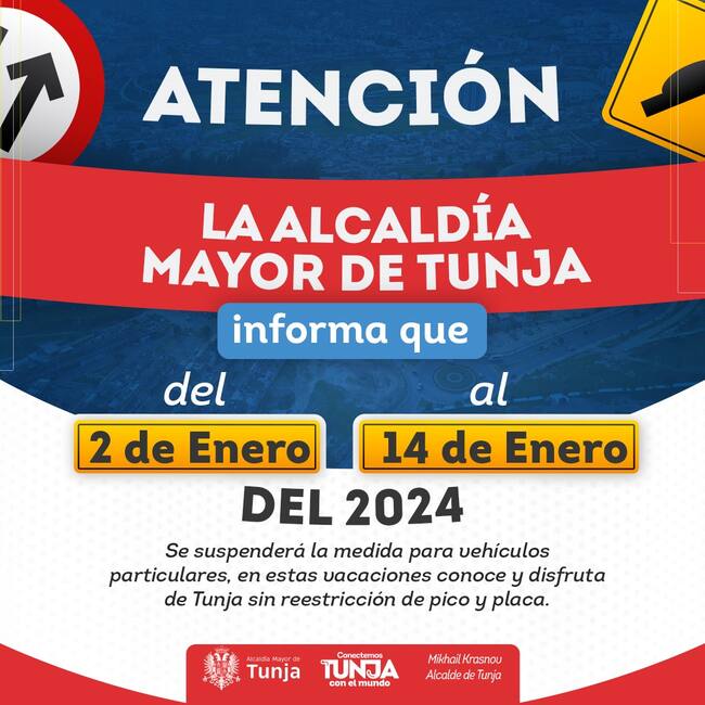 El alcalde de Tunja Mikhail Krasnov emitió el decreto 0011 del 02 de enero de 2024, por medio del cual, suspende temporalmente las disposiciones normativas en materia de restricción para vehículos de servicio particular que había adoptado el exalcalde Alejandro Fúneme mediante decreto 097, de febrero 20 de 2023.