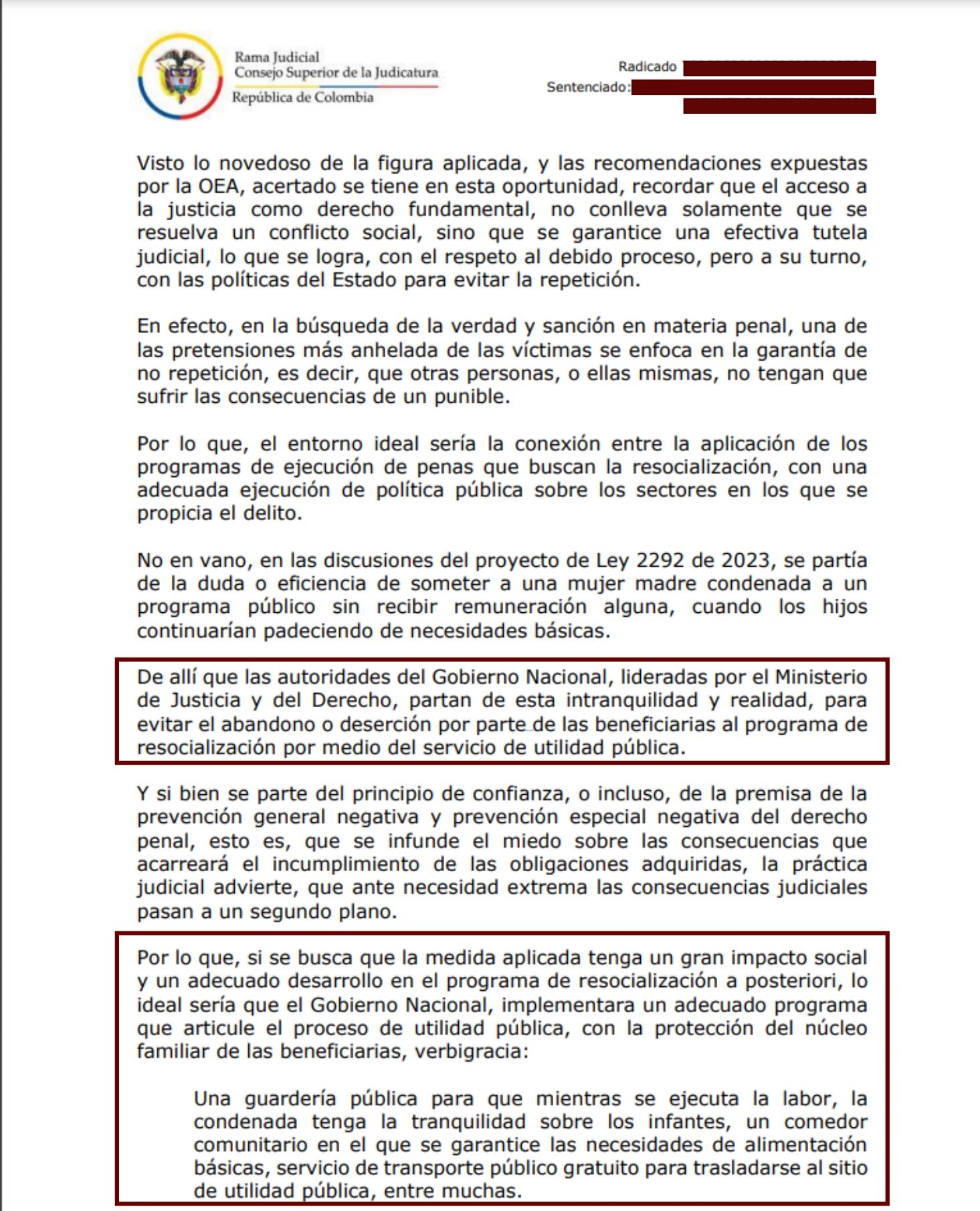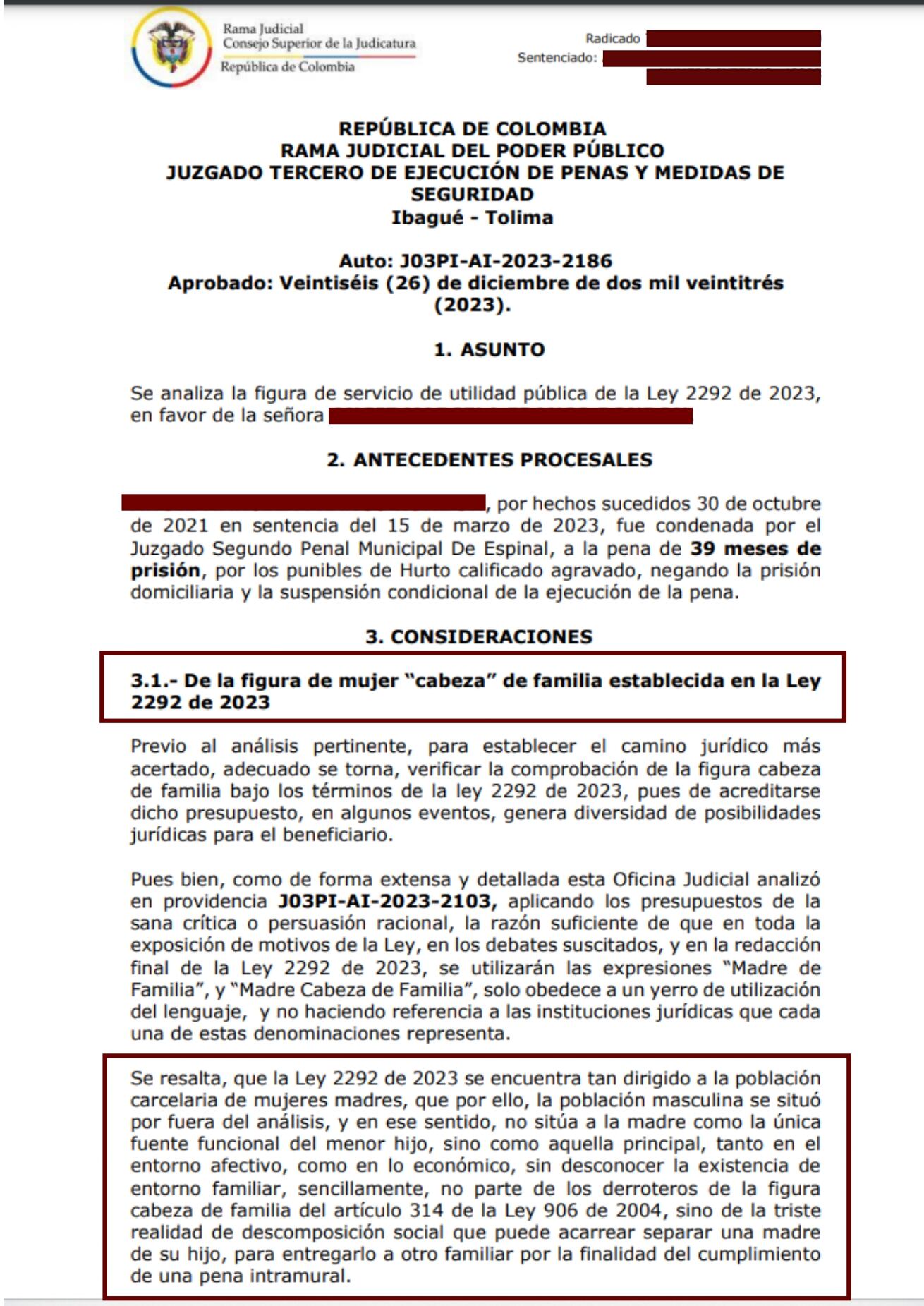 El Juzgado Tercero de Ejecución de Penas de Ibagué, concedió la primera libertad bajo la figura de mujer “cabeza de familia” establecida en la Ley 2292 de 2023, o ley de “servicio de utilidad pública”.