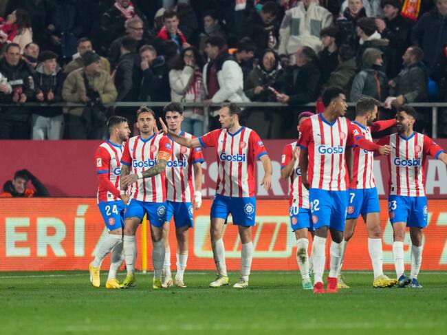 Los jugadores del Girona celebran su cuarto gol durante el encuentro correspondiente a la jornada 19 de LaLiga EA Sports que Girona y Atlético de Madrid disputaron en el estadio Montilivi, en Girona. EFE / Siu Wu. / Siu Wu (EFE)