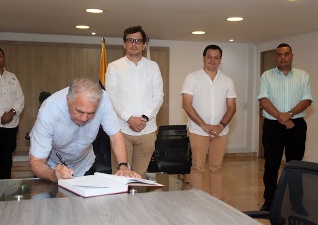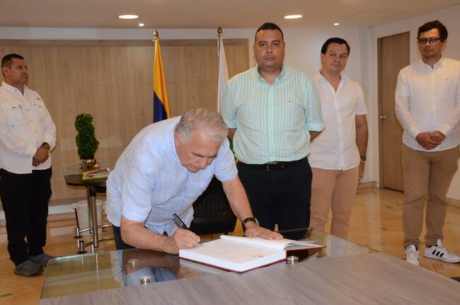 Firmaron acta ante el primer mandatario de los huilenses los neivanos, Rodrigo Hernández, secretario Privado, Óscar Gutiérrez Flórez, jefe de Prensa y el palermuno, Carlos Alfredo Mosquera, director del Instituto de Transportes y Tránsito del Huila.