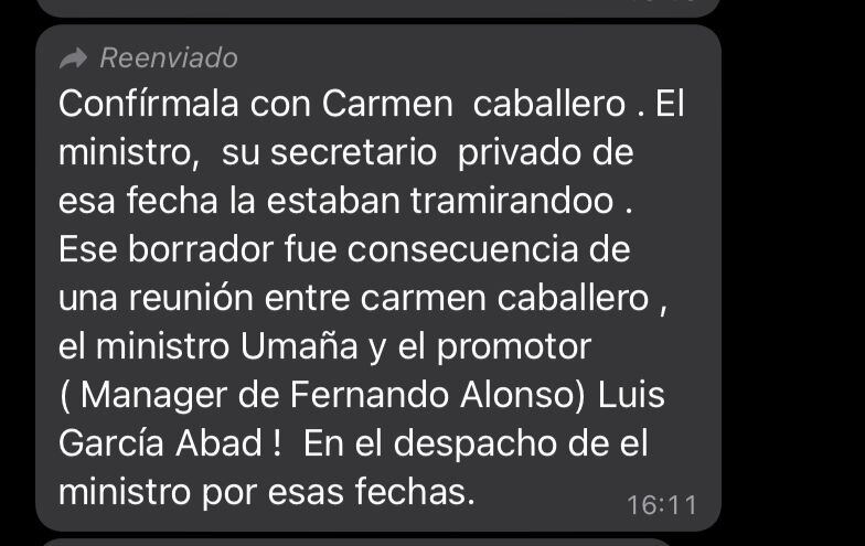 Se trata del borrador de una carta, con fecha 24 de noviembre de 2022, que estaba siendo preparada por el ministro de Comercio, Germán Umaña, la cual iba a ser dirigida a Stefano Domenicali, presidente y consejero delegado de la Fórmula 1.