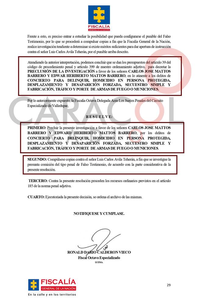 La Fiscalía ordenó la preclusión de la investigación que cursaba en contra de Carlos Mattos Barrero, y su hermano Edward Heriberto Mattos Barrero