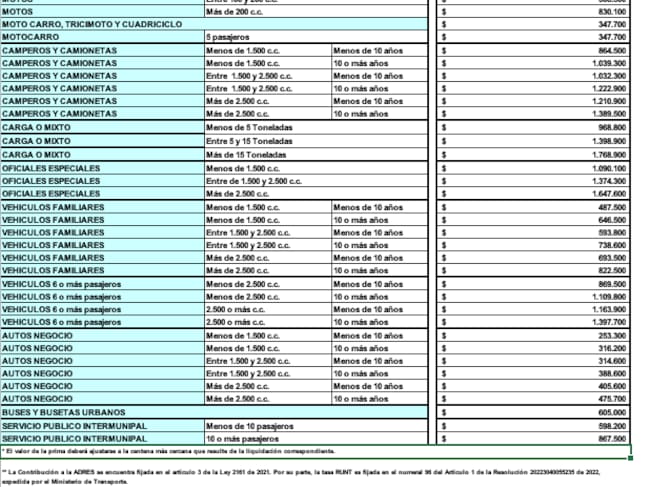 De acuerdo con la Superintendencia, el aumento para las categorías que cuentan con el descuento mencionado es del 10,97% aproximadamente, correspondiente a la variación anual de la Unidad de Valor Tributario (UVT) establecido por la DIAN. Mientras tanto, para el resto de los vehículos el aumento será del 18,4% y su valor final se ajustará dependiendo del cilindraje y la antigüedad de los vehículos.