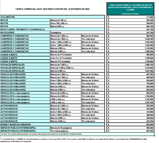 Luego de que el Ministerio de Hacienda publicara el decreto 2312 del 2024, que autoriza a la Superintendencia Financiera a actualizar las tarifas del Seguro Obligatorio de Accidentes de Tránsito, SOAT, para el 2024, se conocieron las tarifas que comenzarán a regir en todo el país a partir del miércoles 10 de enero.