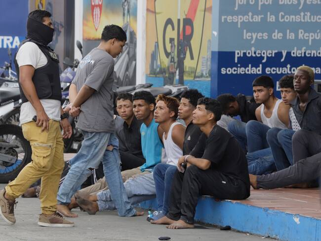 AME8394. GUAYAQUIL (ECUADOR), 10/01/2024.- Un policía custodia hoy a los detenidos de un grupo armado por la toma temporal de un canal de televisión ayer, en Guayaquil (Ecuador). La Policía ecuatoriana confirmó que se detuvieron a trece hombres a los que se les incautaron armas, granadas y material explosivo, luego de que un comando fuertemente armado ocupara durante unas horas un canal de televisión en Guayaquil. Ecuador está en estado de excepción por sesenta días, que incluye un toque de queda durante la noche y madrugada, debido a una serie de incidentes en cárceles, que se desataron el lunes, y la "presunta evasión" de uno de los delincuentes más peligrosos del país. EFE/ Carlos Durán Araújo / Carlos Duran Araujo (EFE)