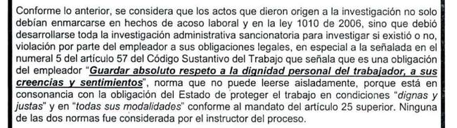 El documento explica que “no es comprensible la agilidad que se le dio al trámite y al archivo de la queja” desde la dirección territorial. Además, establece que se desconocieron los últimos hechos del proceso, donde los trabajadores denuncian que aún son víctimas de violencia laboral, y también se habría hecho caso omiso a las consecuencias que generó la primera denuncia y las posibles retaliaciones que se tomaron en contra de los trabajadores.