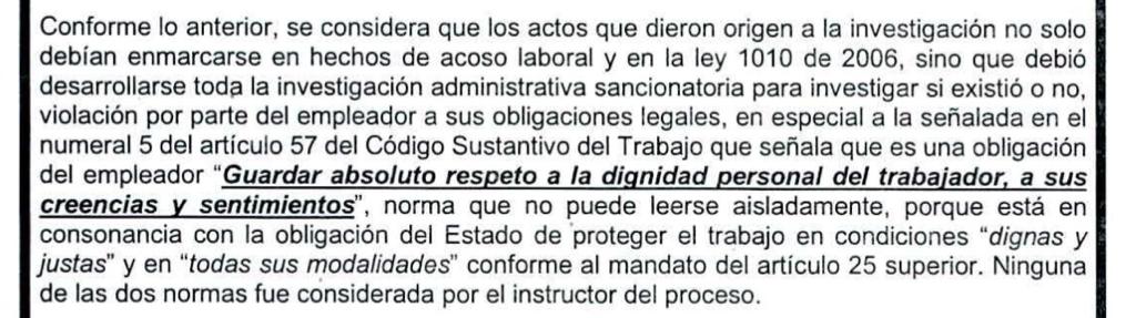 El documento explica que “no es comprensible la agilidad que se le dio al trámite y al archivo de la queja” desde la dirección territorial. Además, establece que se desconocieron los últimos hechos del proceso, donde los trabajadores denuncian que aún son víctimas de violencia laboral, y también se habría hecho caso omiso a las consecuencias que generó la primera denuncia y las posibles retaliaciones que se tomaron en contra de los trabajadores.