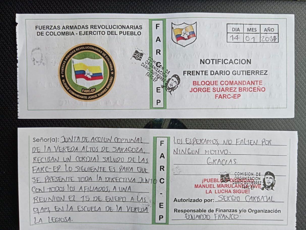 La notificación habría sido realizada, según las boletas entregadas por el Frente Darío Gutiérrez, Bloque comandante Jorge Suarez de las FARC - EP.