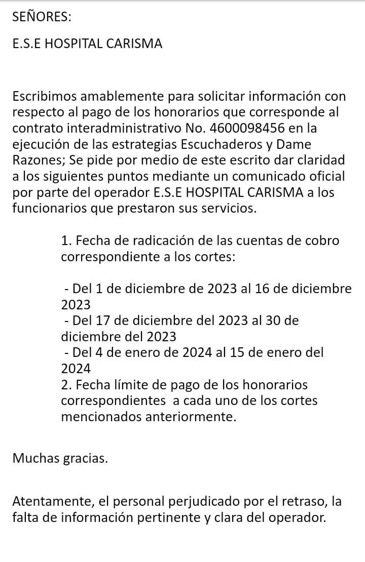 Además, los contratistas perjudicados manifestaron temor a revelar su identidad por posibles represalias en futuros contratos y la pérdida de oportunidades laborales. Sin embargo, el día de hoy se enviará una carta hacia la E.S.E Carisma, por parte de los contratistas exigiendo claridad al respecto.