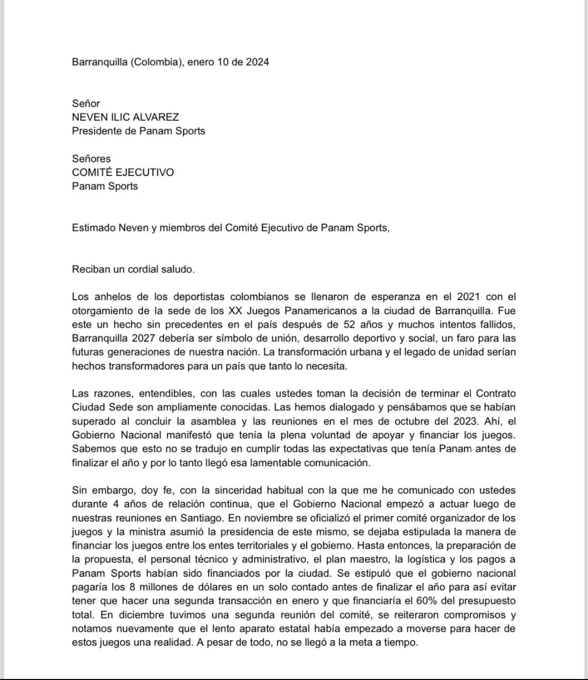 Carta de Jaime Pumarejo sobre los Juegos Panamericanos 2027.