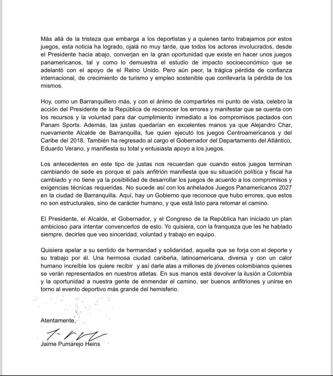 A través de una carta, el exalcalde de Barranquilla Jaime Pumarejo pidió a la organización Panam Sports que reconsidere su decisión de revocar la sede de los XX Juegos Panamericanos 2027 a la capital del Atlántico.