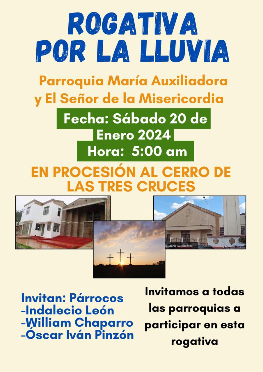 “El día sábado (20 de enero), se va a hacer una rogativa, (…) se le ha comentado a otras parroquias para que se unan en torno a esta rogativa porque la idea es que desde cada parroquia la gente salga en procesión hacia el cerro de Las tres cruces, en procesión desde las 5 de la mañana, para celebrar un acto religioso, litúrgico en el cerro, en compañía de varios de los sacerdotes de nuestra diócesis, varias parroquias van a traer a sus santos para encomendarnos a ellos y pedir el don de la lluvia”, confirmó la veedora.