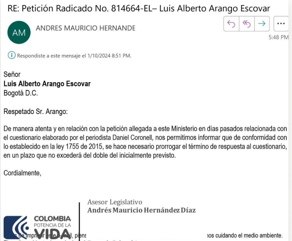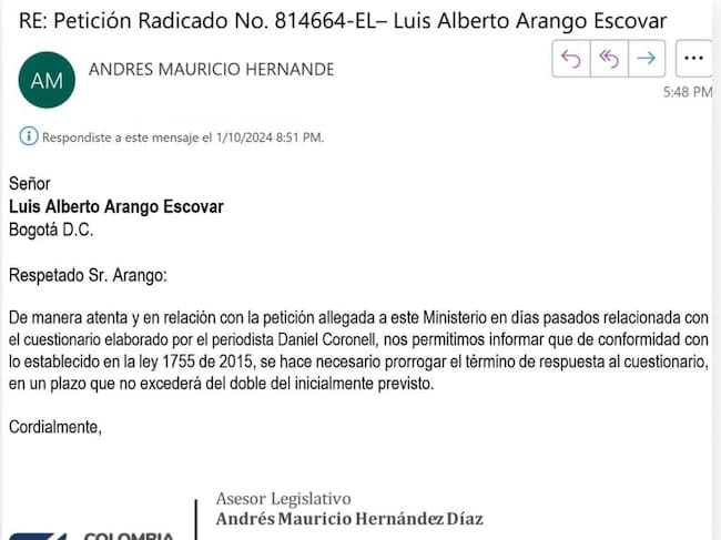 Al doctor Arango le respondió el 10 de enero, Andrés Mauricio Hernández, que es el asesor legislativo de la Cancillería es decir un encargado de las relaciones con el Congreso. En la respuesta le dice que no puede responder aún y que prorrogará el término del derecho de petición.