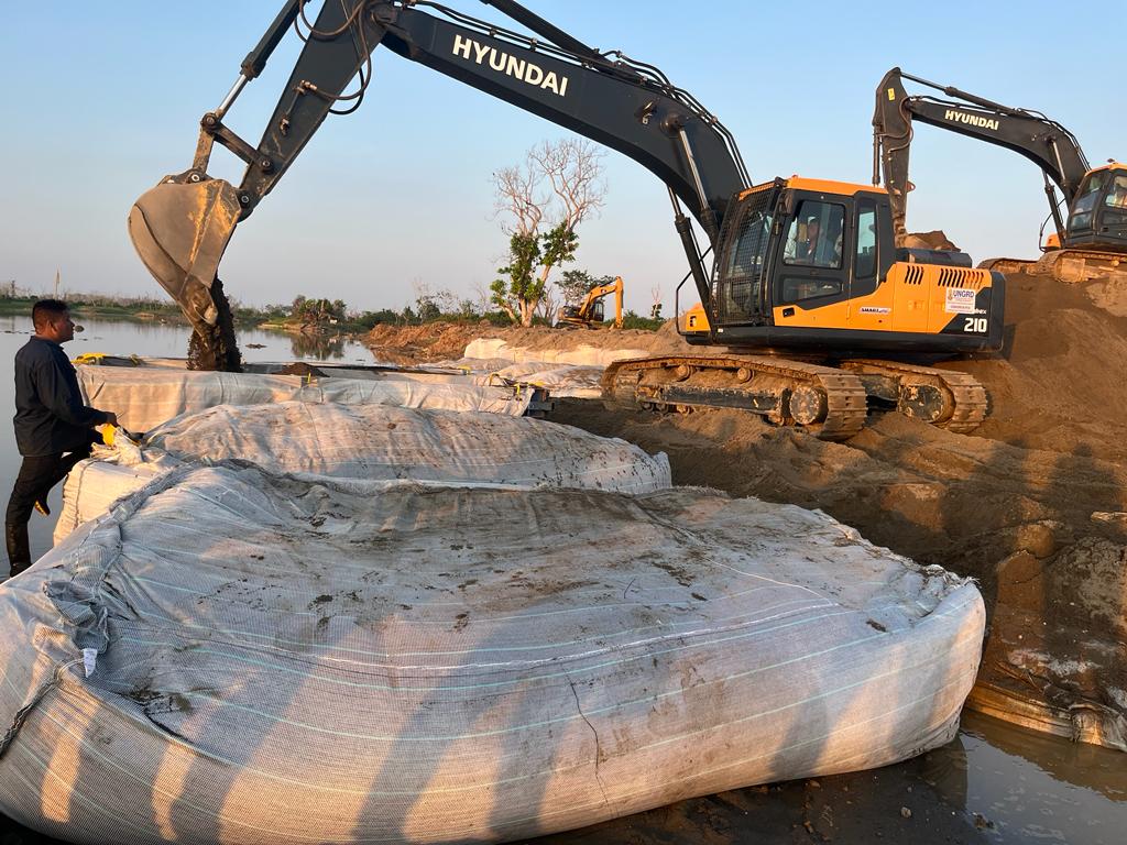 Con este fin, se han habilitado dos frentes de obra en los puntos km 1+200 y k1+300 en dirección Nechí (Antioquia) – San Jacinto del Cauca (Bolívar), donde se desempeñan 50 personas con el apoyo de 7 excavadoras de 22 toneladas, 12 volquetas doble troque, 12 formaletas, 12 máquinas cosedoras y 5 plantas eléctricas. En esta primera etapa, se instalarán más de 5600 geobolsas en los dos frentes de obra activos.