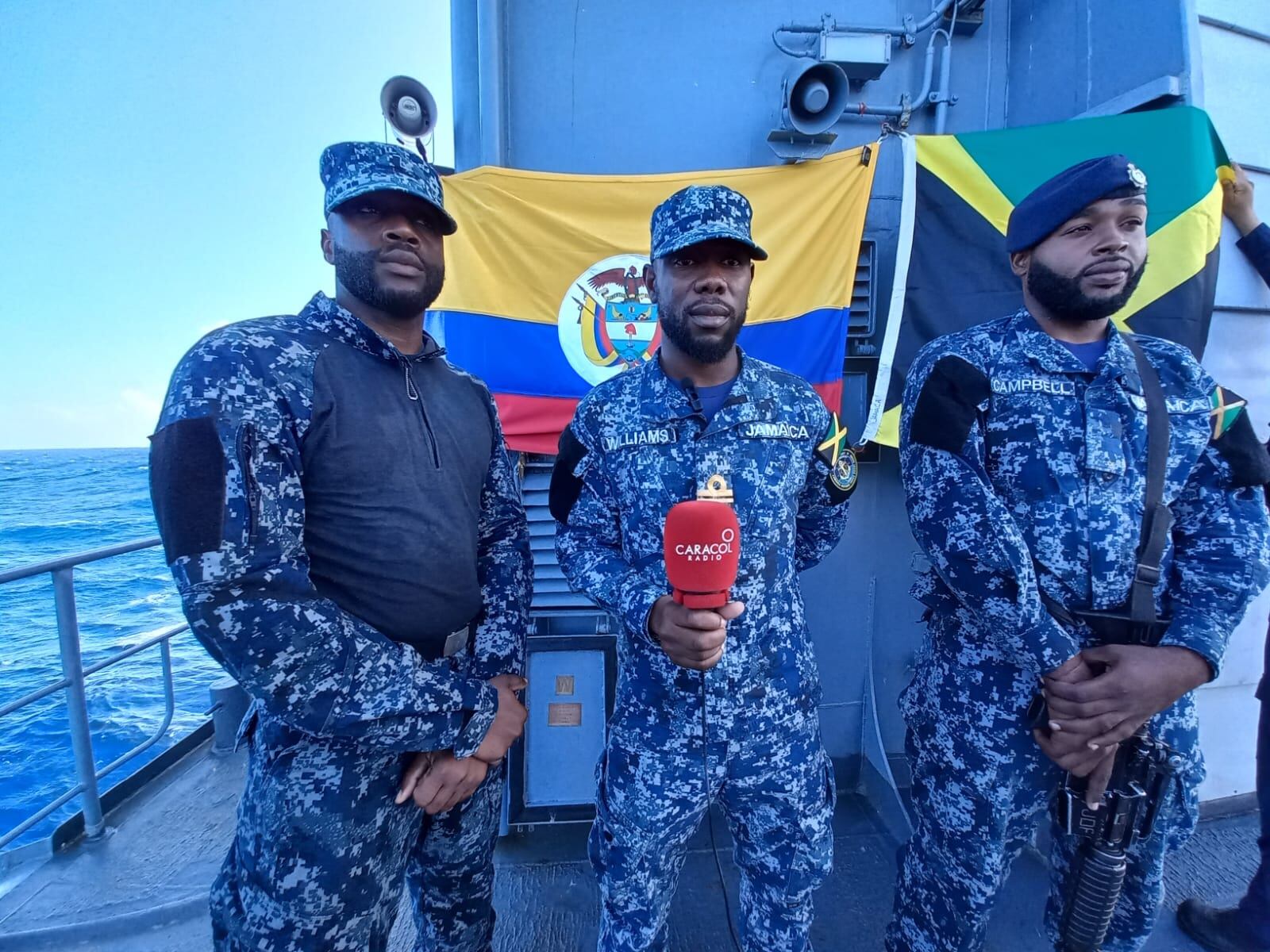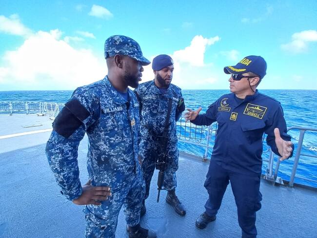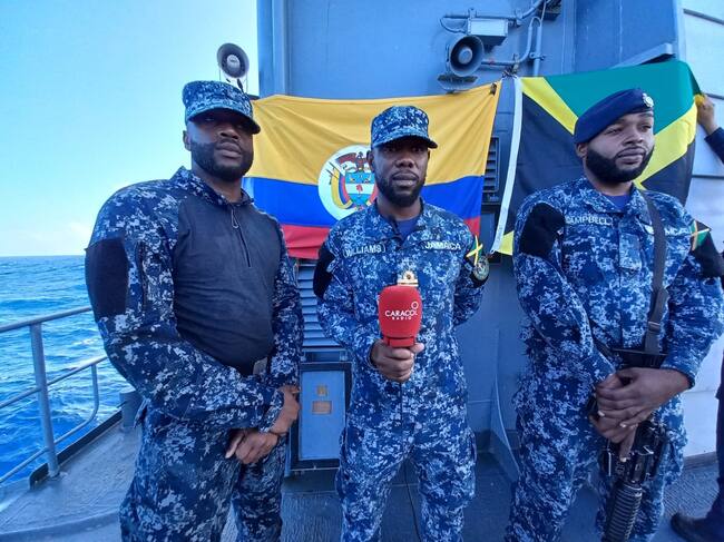 Capitán Farid Vargas y militares jamaiquinos en la fragata ARC "Almirante Padilla. Cortesía: Luis Ernesto Caicedo, Caracol Radio.