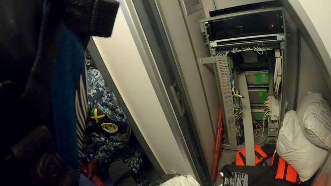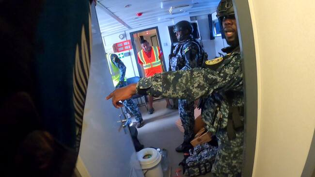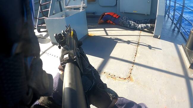 El bote zodiac alcanza la supuesta nave, los militares la abordan y someten a los sospechosos. Al final, reportan los hallazgos a sus superiores: fusiles AK 47, M4 calibre 156, costales de langosta producto de pesca ilegal y 15 panelas rectangulares que podrían tener cocaína.