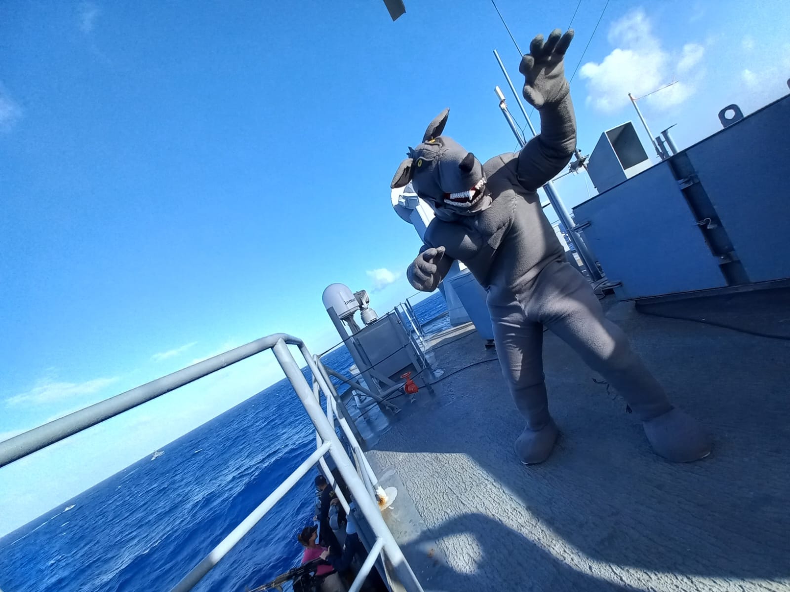 Las embarcaciones analizan la fuerza del viento, la altura de las olas y la corriente del mar para ubicar la proa y realizar la aproximación. En esta ocasión, la Armada de Colombia subió a la cubierta a un marinero vestido con ‘Lobo de mar’, que representa la audacia y ferocidad del ARC ‘Almirante Padilla’ en el mar.
