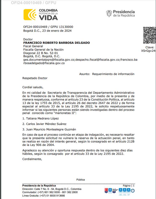 La Secretaria de Transparencia de la Presidencia de la Republica, liderada por Andrés Idarraga, presentó una carta a la Fiscalía General de la Nación instándola a determinar la posible implicación de tres funcionarios en el caso de corrupción conocido como “Marionetas II”.