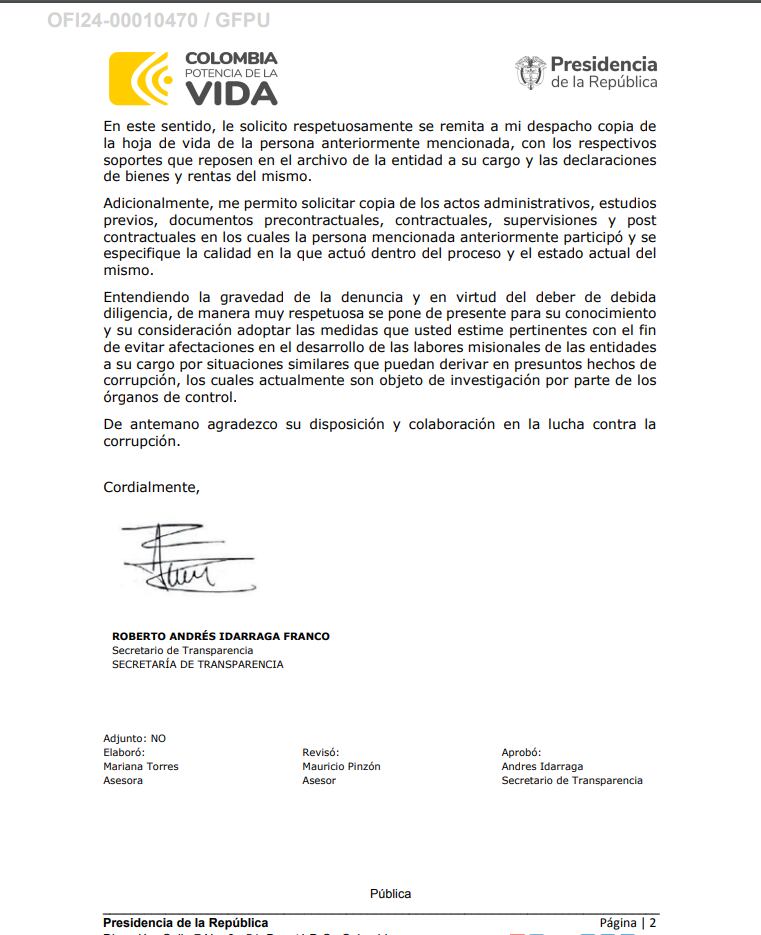 Por ello, Idárraga también envió cartas a los ministerios solicitando una copia de las hojas de vida de los funcionarios señalados, también ha requerido copias de los actos administrativos, estudios previos y documentos contractuales en los que estas personas hayan participado, con el objetivo de verificar cualquier irregularidad en los procesos.