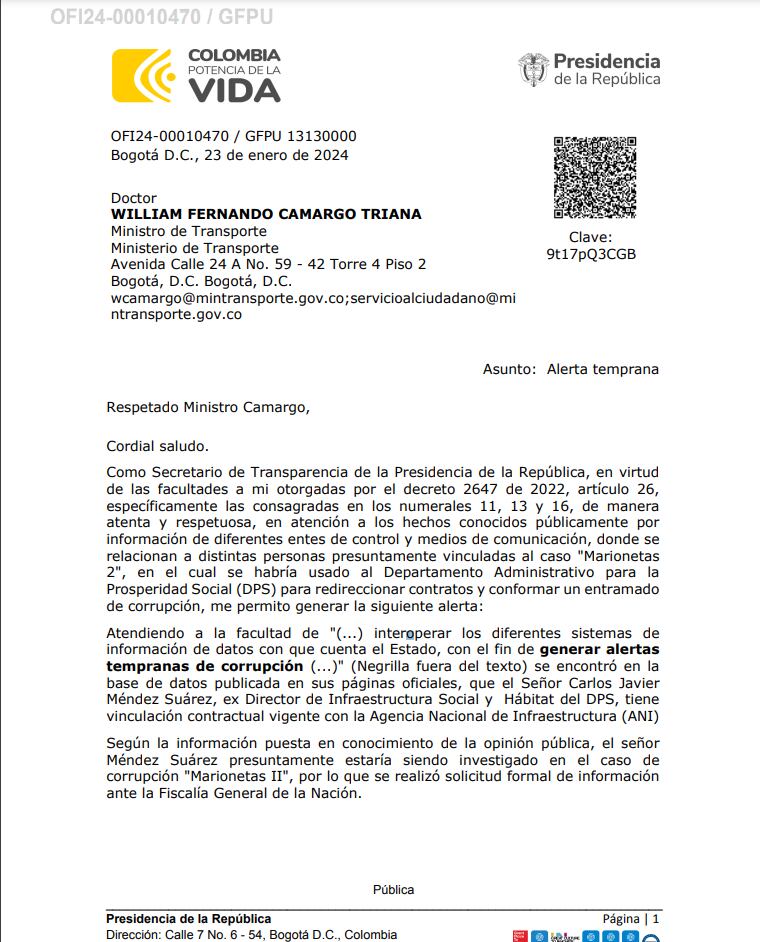 La Secretaria de Transparencia de la Presidencia de la Republica, liderada por Andrés Idarraga, presentó una carta a la Fiscalía General de la Nación instándola a determinar la posible implicación de tres funcionarios en el caso de corrupción conocido como “Marionetas II”.