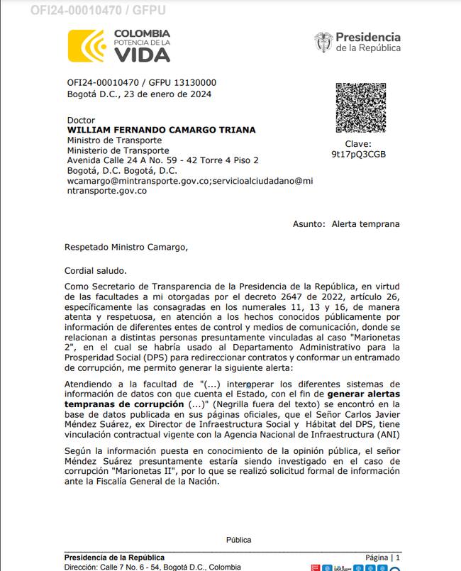 En la carta, el secretario pide investigar a Carlos Javier Méndez Suárez, exdirector de Infraestructura Social y Hábitat del DPS y quien actualmente tiene contrato en la ANI, también a Tatiana Medrano López excontratista de la Subdirección de Contratos y Seguimiento.