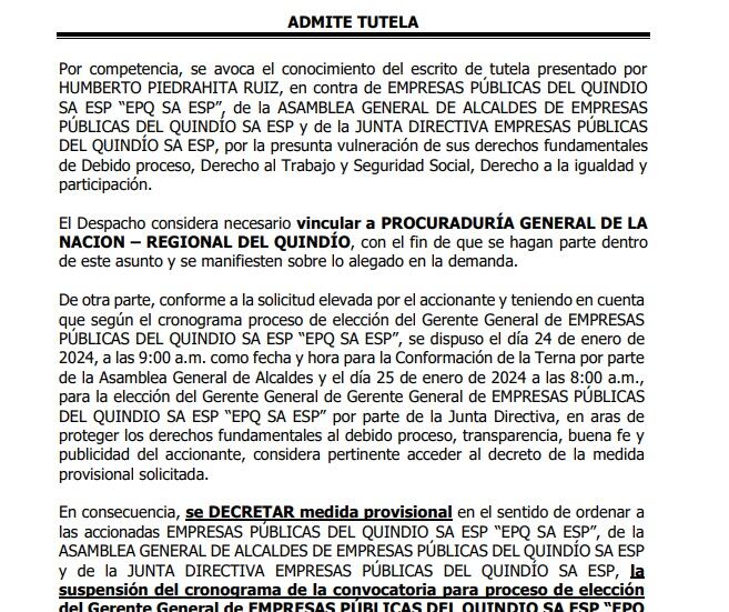 Es así como el Juzgado Quinto Civil Municipal admitió la tutela y decretó medida provisional en el sentido de ordenar la suspensión del cronograma de la convocatoria para proceso de elección del Gerente hasta que se decida de fondo esta tutela.