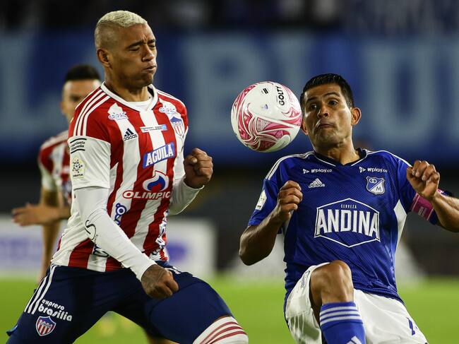 Jermein Peña (Junior) y David Mackalister Silva (Millonarios) disputan un balón.(Colprensa - John Paz) / John Paz