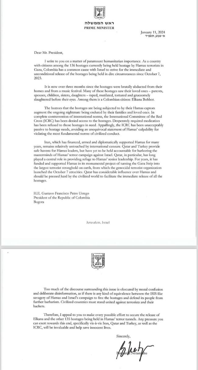 En la misiva fechada el 11 de enero del presente año, Netanyahu invita al presidente Petro, que Colombia se una a las labores de Qatar y Turquía, que si bien han sido países que brindan refugió político y territorial al movimiento islamista Hamás, también Israel ha aceptado que han presionado por la liberación de rehenes en la Franja de Gaza.