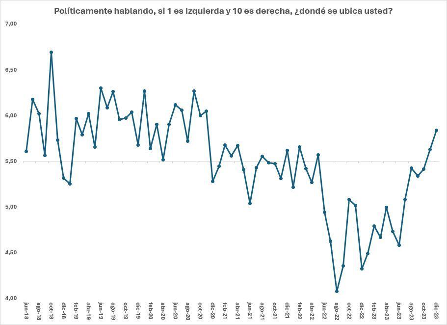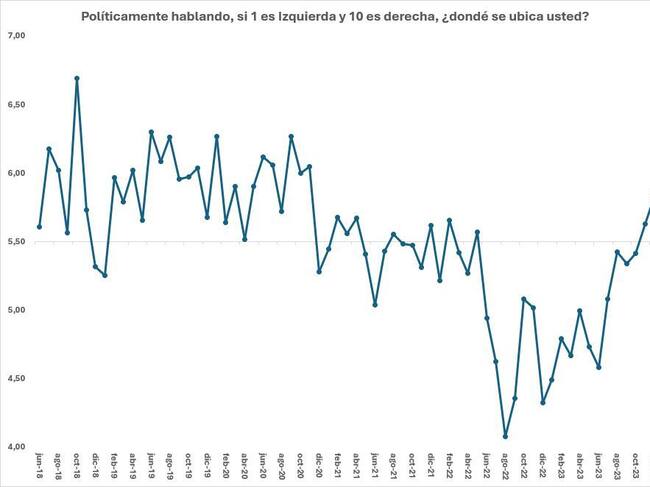 Los resultados indican que la inclinación hacia la izquierda ha disminuido desde que Gustavo Petro llegó al poder, pues desde agosto del 2022 cuando ganó las elecciones presidenciales, la nota era de 4 y hoy se encuentra en 6, es decir está encima de la mitad. Esto en una votación en donde 1 es la izquierda y 10 la Derecha.