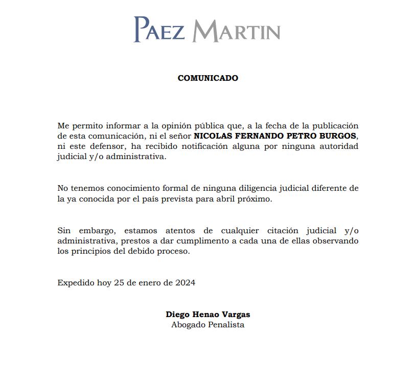 La firma de abogados Páez Martín, que ejerce la defensa de Nicolás Petro, en un comunicado asegura los siguiente: “No tenemos conocimiento formal de ninguna diligencia judicial diferente de la ya conocida por el país prevista para abril próximo. (Es decir, la preparatoria de juicio por enriquecimiento ilícito y lavado de activos).