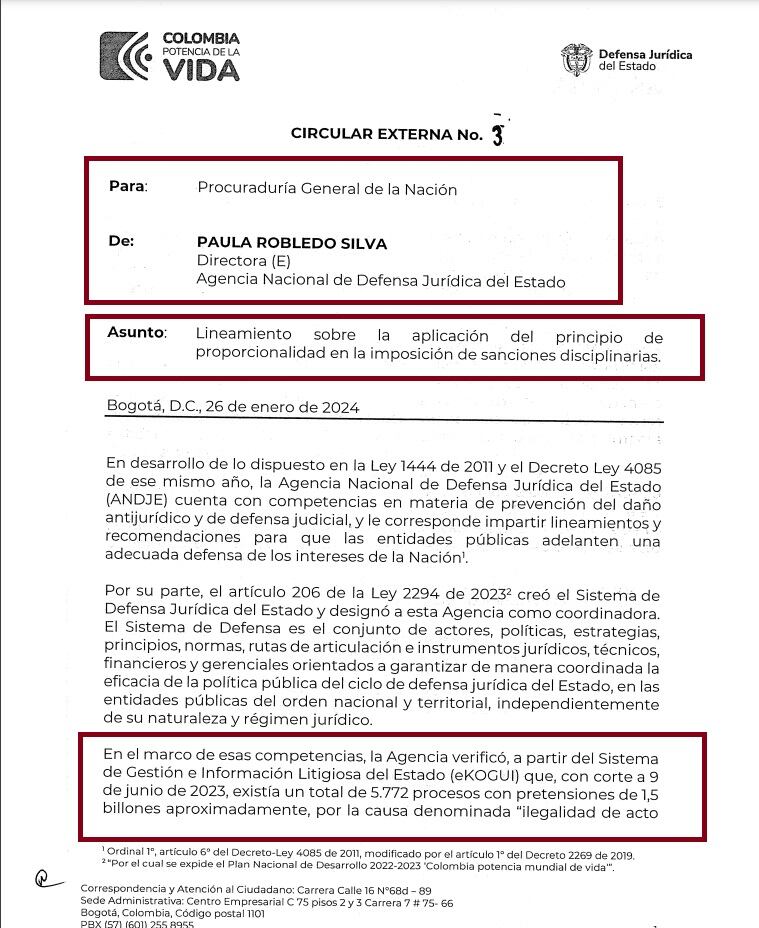 La Agencia de Defensa Jurídica del Estado le envió una circular a la Procuraduría diciendo que aplique el principio de proporcionalidad a la hora de emitir sanciones disciplinarias.