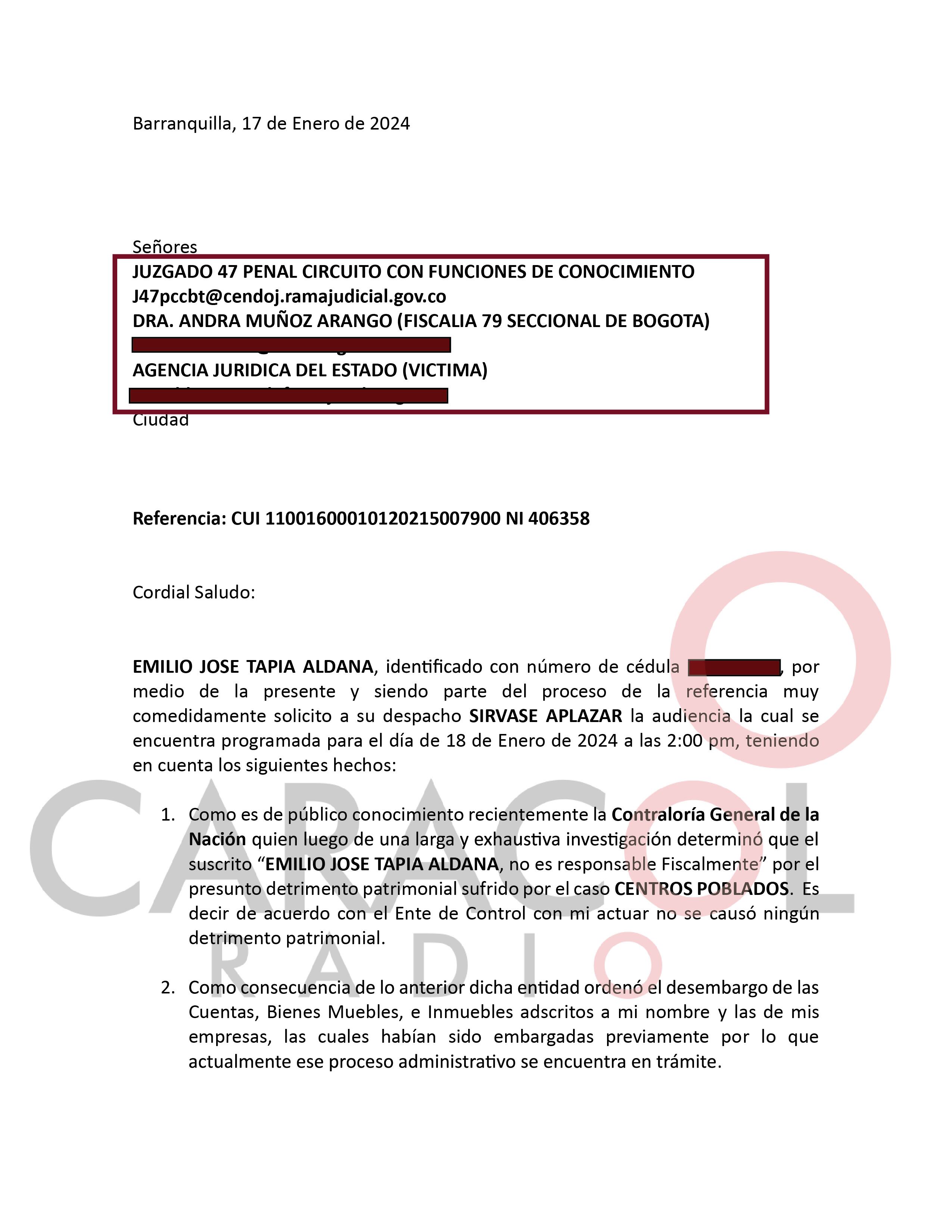 Caracol Radio supo que la audiencia de acusación formal en contra de Emilio Tapia, uno de los señalados “cerebros” del caso Centro Poblados, se aplazó porque el procesado pidió tiempo para devolver los $6.200 millones que robó, mientras le descongelan las cuentas y empresas.