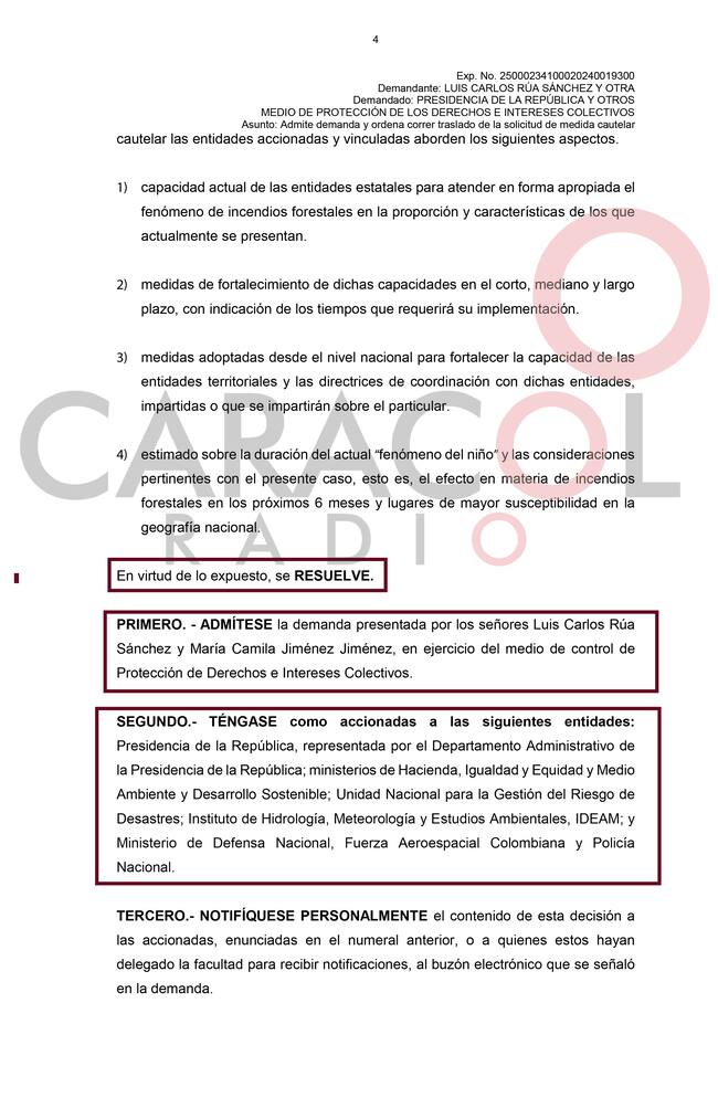 Se lee en el documento que, mediante esta acción popular se pretende la protección de bosques y páramos del país que se están consumiendo por incendios forestales. El Tribunal negó una medida cautelar solicitada porque dicha petición no se argumentó.
