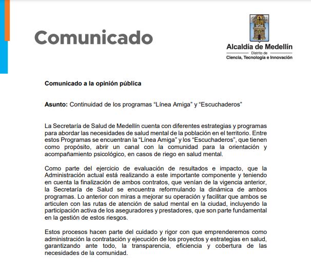 La administración municipal hizo un comunicado a la opinión pública en el que se aclara que “la Secretaría de Salud se encuentra reformulando la dinámica de ambos programas. Lo anterior con miras a mejorar su operación y facilitar que ambos se articulen con las rutas de atención de salud mental en la ciudad”.