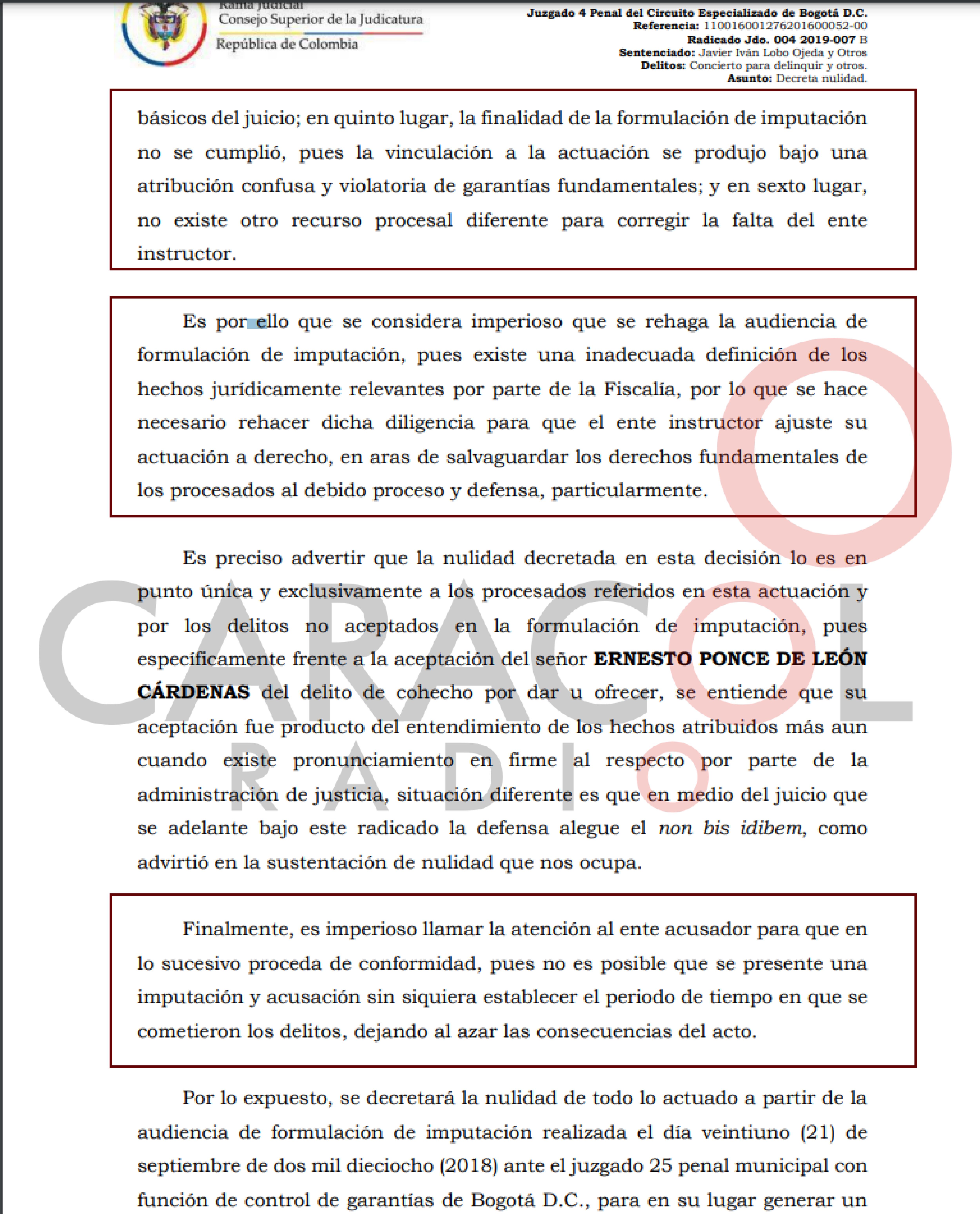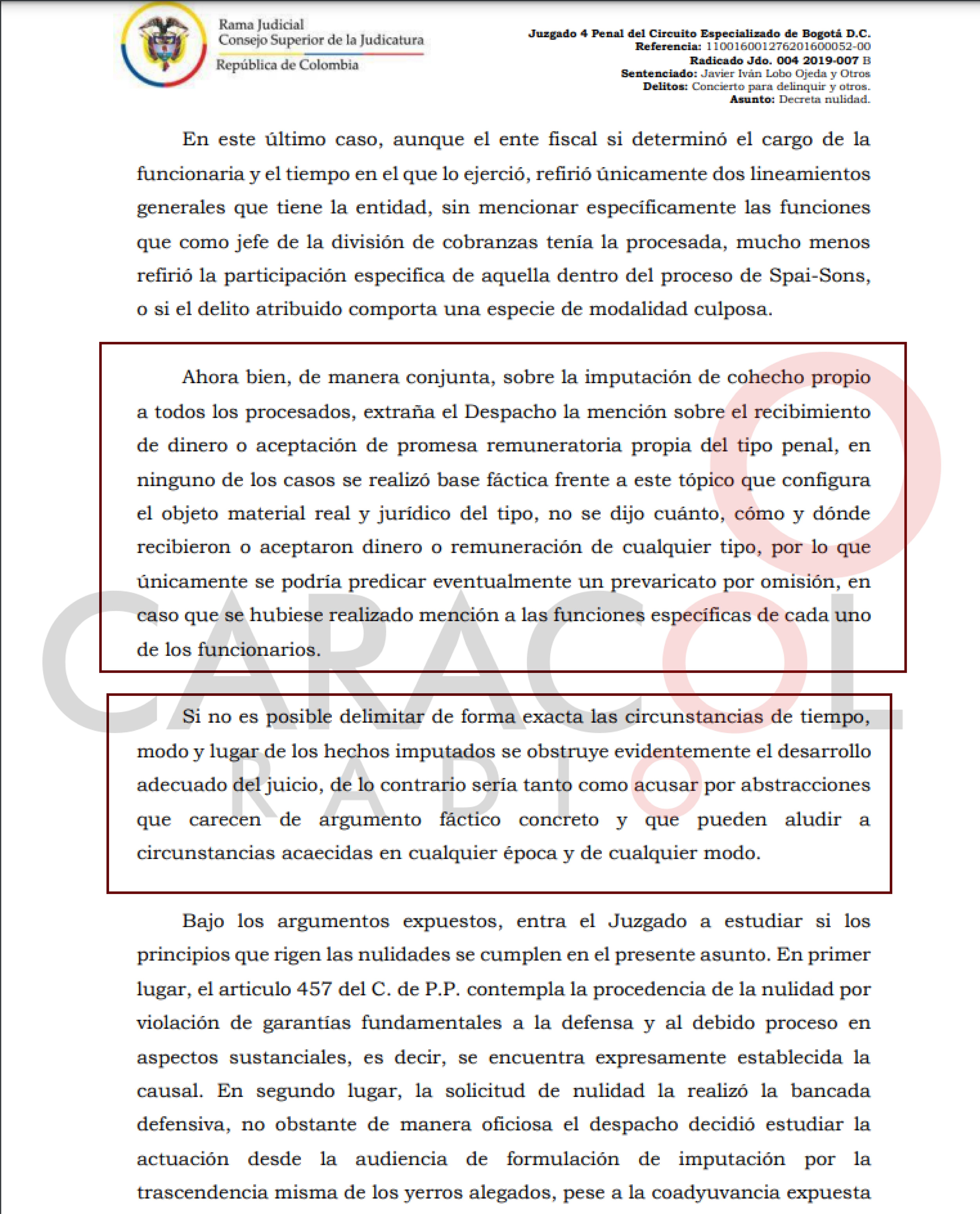 “Sobre la imputación de cohecho propio a todos los procesados, dice el juez, que extraña el despacho la mención sobre el recibimiento de dinero o aceptación de promesa remuneratoria propia del tipo penal, en ninguno de los casos se dijo cuánto, cómo y dónde recibieron o aceptaron dinero o remuneración de cualquier tipo, por lo que únicamente se podría predicar eventualmente un prevaricato por omisión, en caso que se hubiese realizado mención a las funciones específicas de cada uno de los funcionarios”. Se lee en la sentencia.