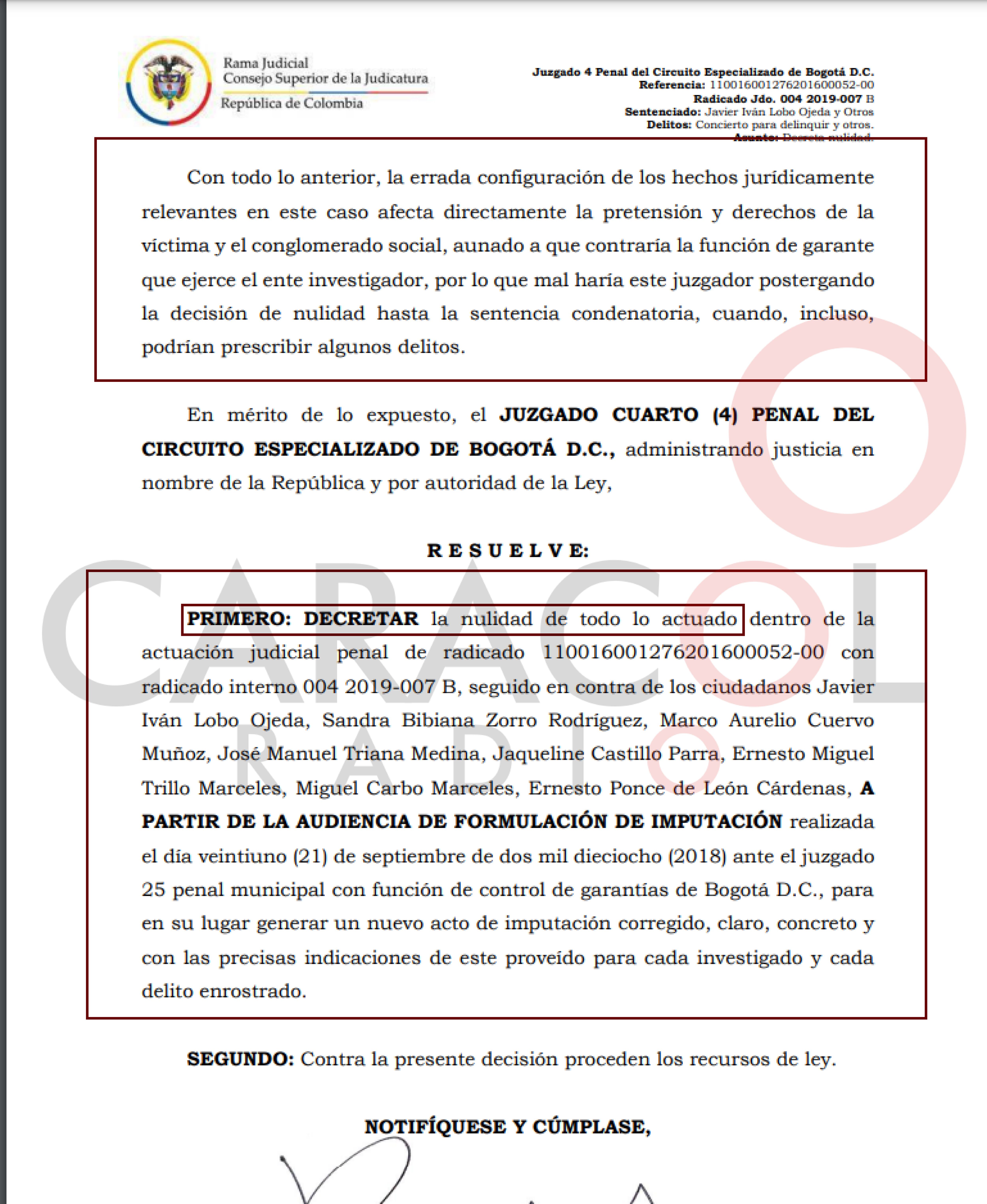 El juez revisó las decisiones de su antecesor, y las peticiones de nulidad planteadas por la defensa, y concluyó que hay múltiples irregularidades en ese proceso.