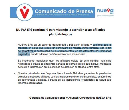 Por otra parte la Nueva EPS realizó un comunicado en el que se menciona que los afiliados objeto de este cambio, han sido notificados a través de diferentes canales de comunicación y además que la atención en salud q continuará de manera ininterrumpida, con el fin de garantizar la continuidad de sus tratamientos, en las diferentes IPS primarias asignadas.