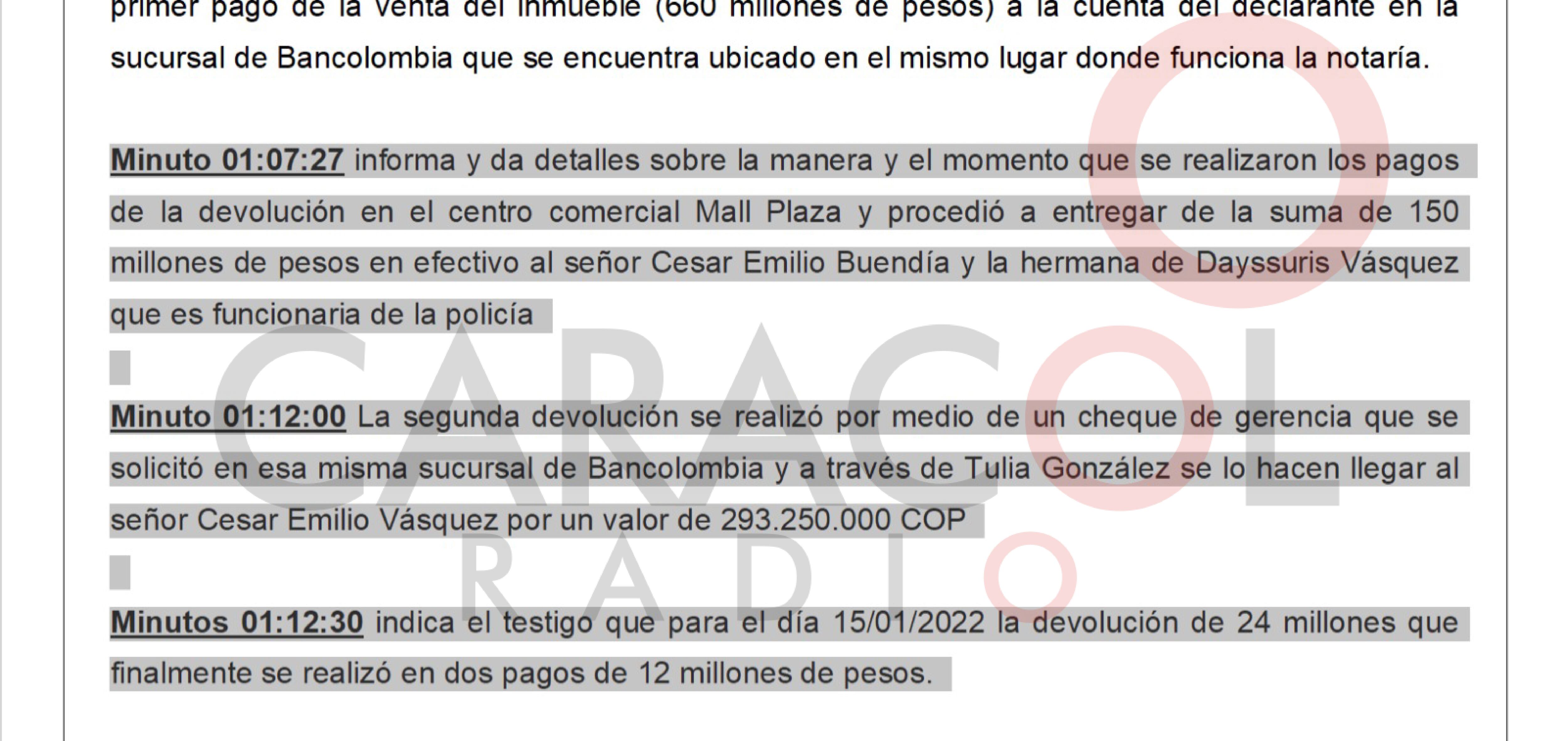 Se lee en el documento, que en el centro comercial Mall Plaza entregó $150 millones en efectivo al señor Cesar Emilio Buendía (Tío de Days) y la hermana de Dayssuris Vásquez que es funcionaria de la policía.