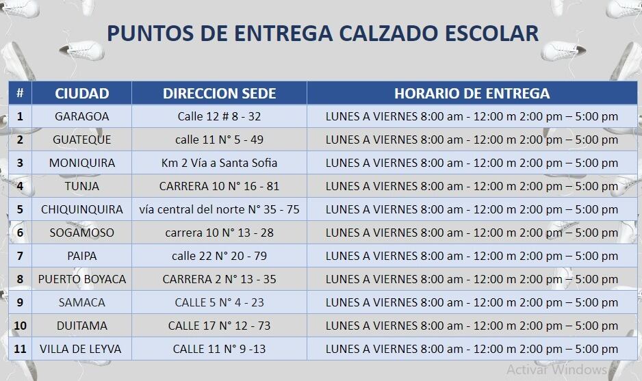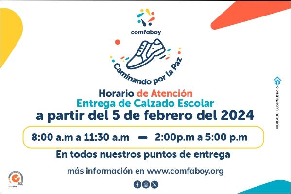 La entrega de estos zapatos se realizará en las sedes de Comfaboy de 8:00 a.m., a 11:30 a.m., y de 2:00 a 5:00 de la tarde.