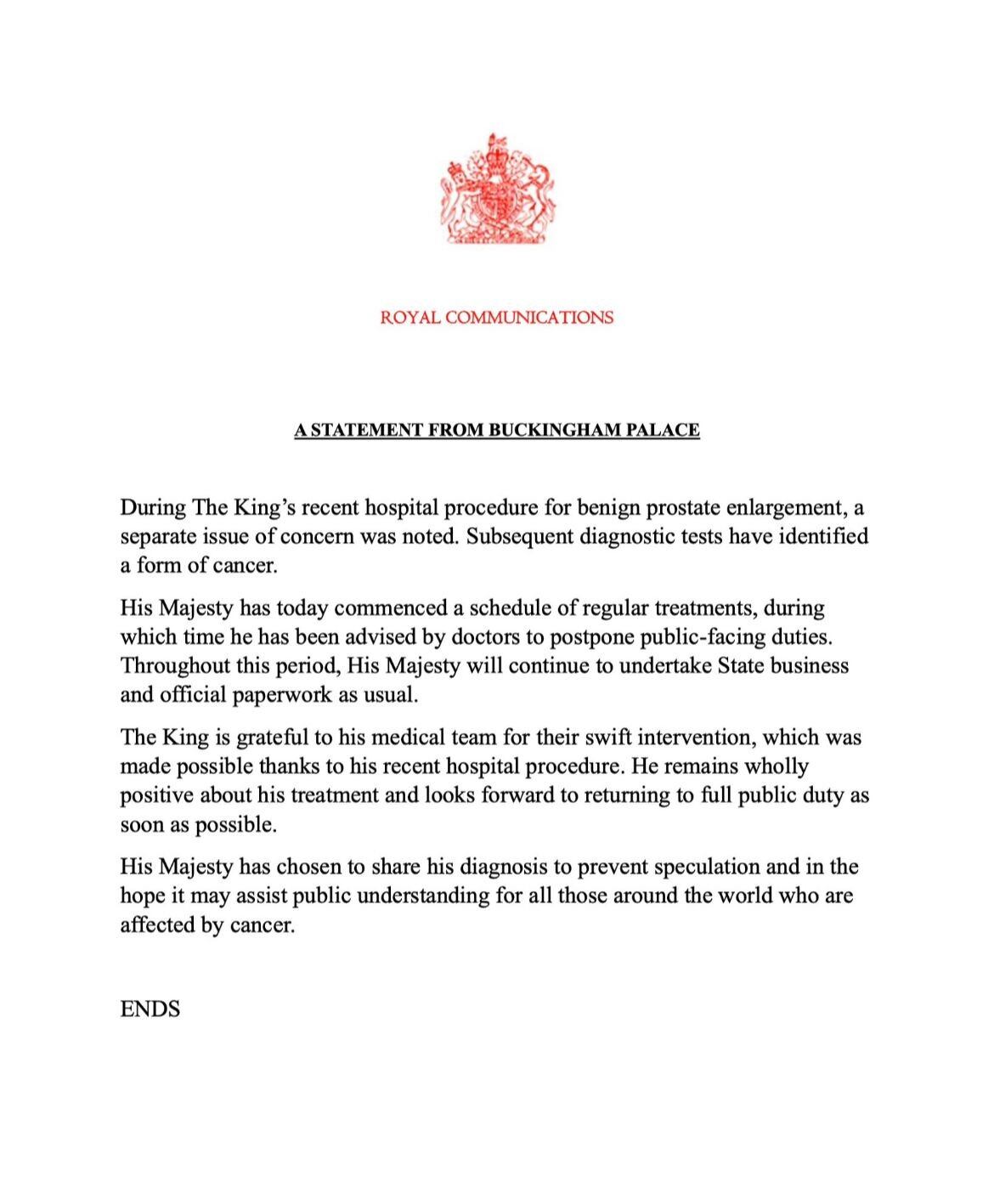 El Palacio de Buckingham informó que “durante la reciente intervención del rey en un hospital por hipertrofia benigna de próstata, se detectó un problema concreto. Las pruebas posteriores identificaron una forma de cáncer”.