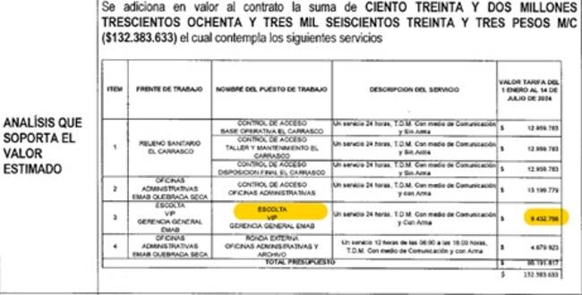 Este tiene fecha de inicio el 2 de febrero del 2023 hasta el 17 de diciembre del mismo año por más de 559 millones de pesos. Todos los servicios parecen normales, hasta que se encuentra un ítem que solicita un escolta VIP para la gerencia general, que está en cabeza de Helbert Panqueva, gerente de la empresa de aseo de Bucaramanga.