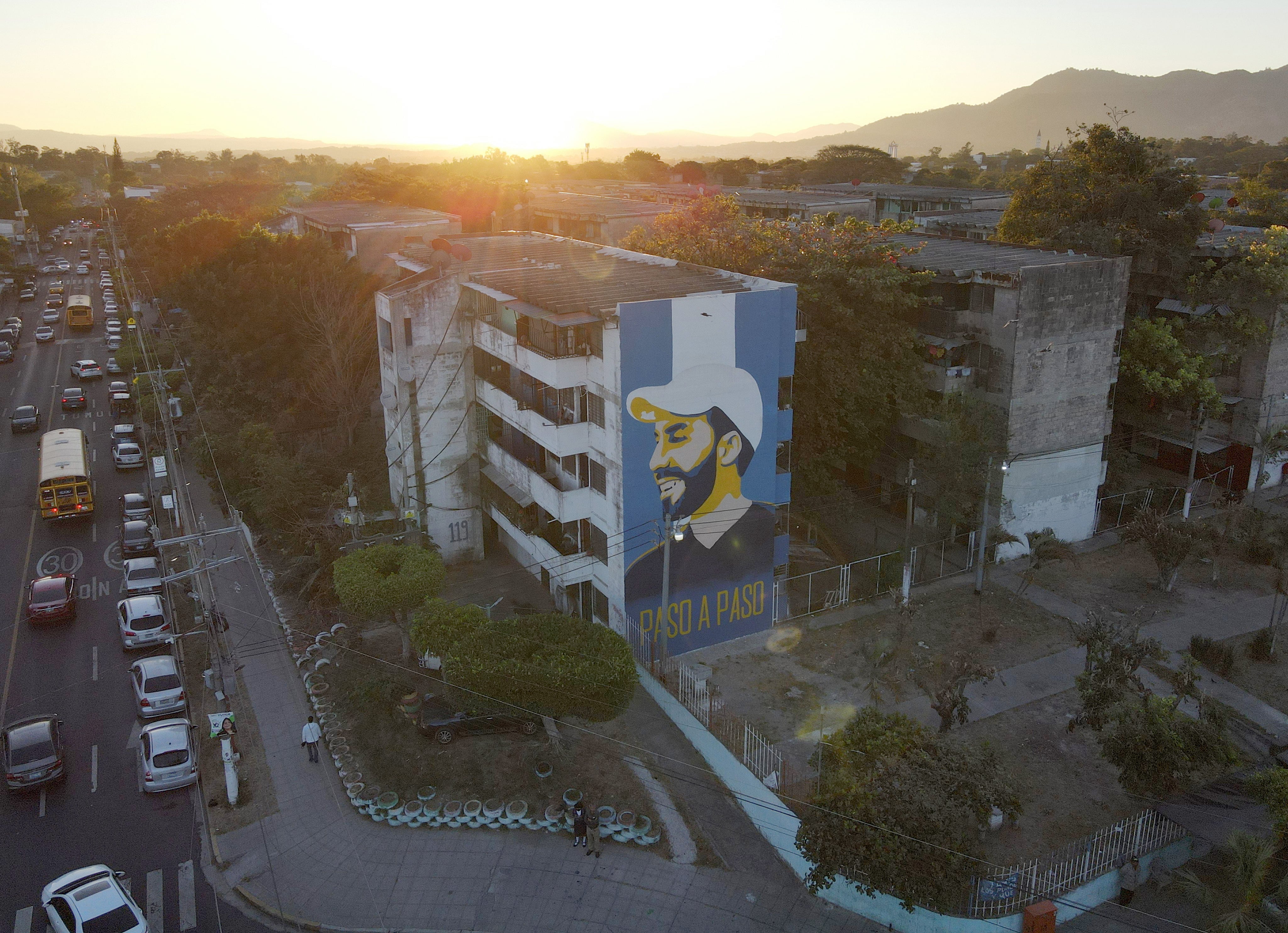 ES3007.SAN SALVADOR (EL SALVADOR) 31/01/2024- Fotografía aérea de un mural alusivo al presidente Nayib Bukele en un edificio multifamiliar, hoy en San Salvador (El Salvador). Los aspirantes a la Presidencia de El Salvador ponen fin este miércoles a una larga campaña electoral que comenzó el 3 de octubre del pasado año y durante la cual apenas ha habido debate político, en buena medida porque el actual presidente Nayib Bukele parte como el gran favorito, con más del 80 %, según las encuestas. EFE/Vladimir Chicas / VLADIMIR CHICAS