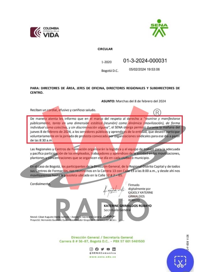 Mediante un comunicado dirigido a los directores de área, jefes de oficina, regionales y subdirectores de centro, la secretaria general del Sena, Katerine Grimaldos, autoriza la participación de los funcionarios y aprendices de la entidad en las movilizaciones convocadas este jueves 8 de febrero por distintas organizaciones sociales.