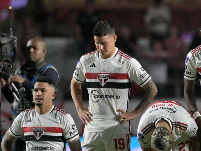 Sao Paulo's forward Luciano (L), Colombian midfielder James Rodriguez (C), and midfielder Wellington Rato react after losing against Liga de Quito in the penalty shoot-out of the Copa Sudamericana quarterfinals second leg football match between Brazil's Sao Paulo and Ecuador's Liga de Quito at the Morumbi stadiumn, in Sao Paulo, Brazil, on August 31, 2023. (Photo by NELSON ALMEIDA / AFP) (Photo by NELSON ALMEIDA/AFP via Getty Images) / NELSON ALMEIDA