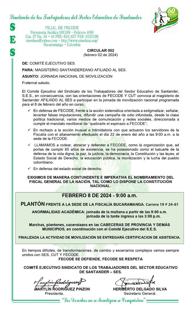 El Sindicato de Educadores de Santander (SES) informó que también estarán participando en el plantón que se va a realizar este jueves 8 de febrero en respaldo a Fecode.